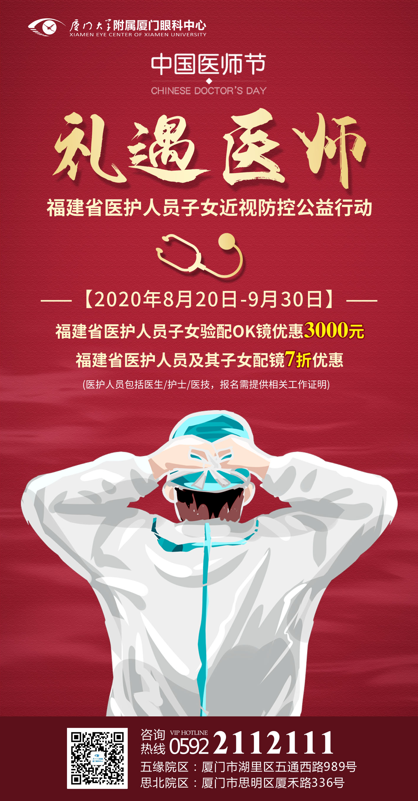 值此醫(yī)師節(jié)到來之際,廈門市衛(wèi)生健康委員會(huì)、廈門市醫(yī)師協(xié)會(huì)、廈門市衛(wèi)生健康委員會(huì)團(tuán)委聯(lián)合海西晨報(bào)發(fā)出“禮遇醫(yī)師”倡議。為響應(yīng)倡議,廈門大學(xué)附屬廈門眼科中心特舉辦福建省“禮遇醫(yī)師”醫(yī)護(hù)人員子女近視防控優(yōu)惠活動(dòng)。