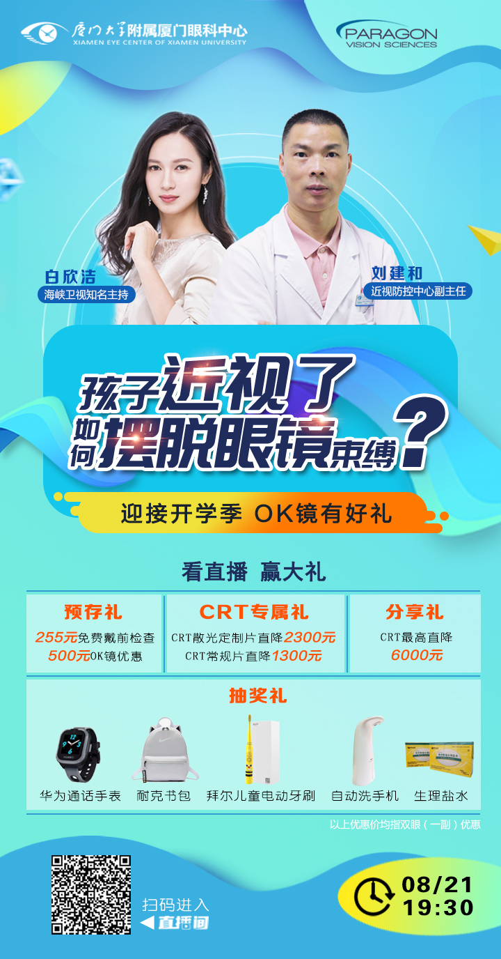 直播現(xiàn)場(chǎng)廈門大學(xué)附屬?gòu)B門眼科中心近視防控中心副主任劉建和將為您帶來(lái)近視防控的小妙招,并展開(kāi)OK鏡原理互動(dòng)介紹、OK鏡真人試戴效果實(shí)測(cè)以及OK鏡佩戴全過(guò)程分享,直播現(xiàn)場(chǎng)更有OK鏡驗(yàn)配大禮包等你來(lái)享。