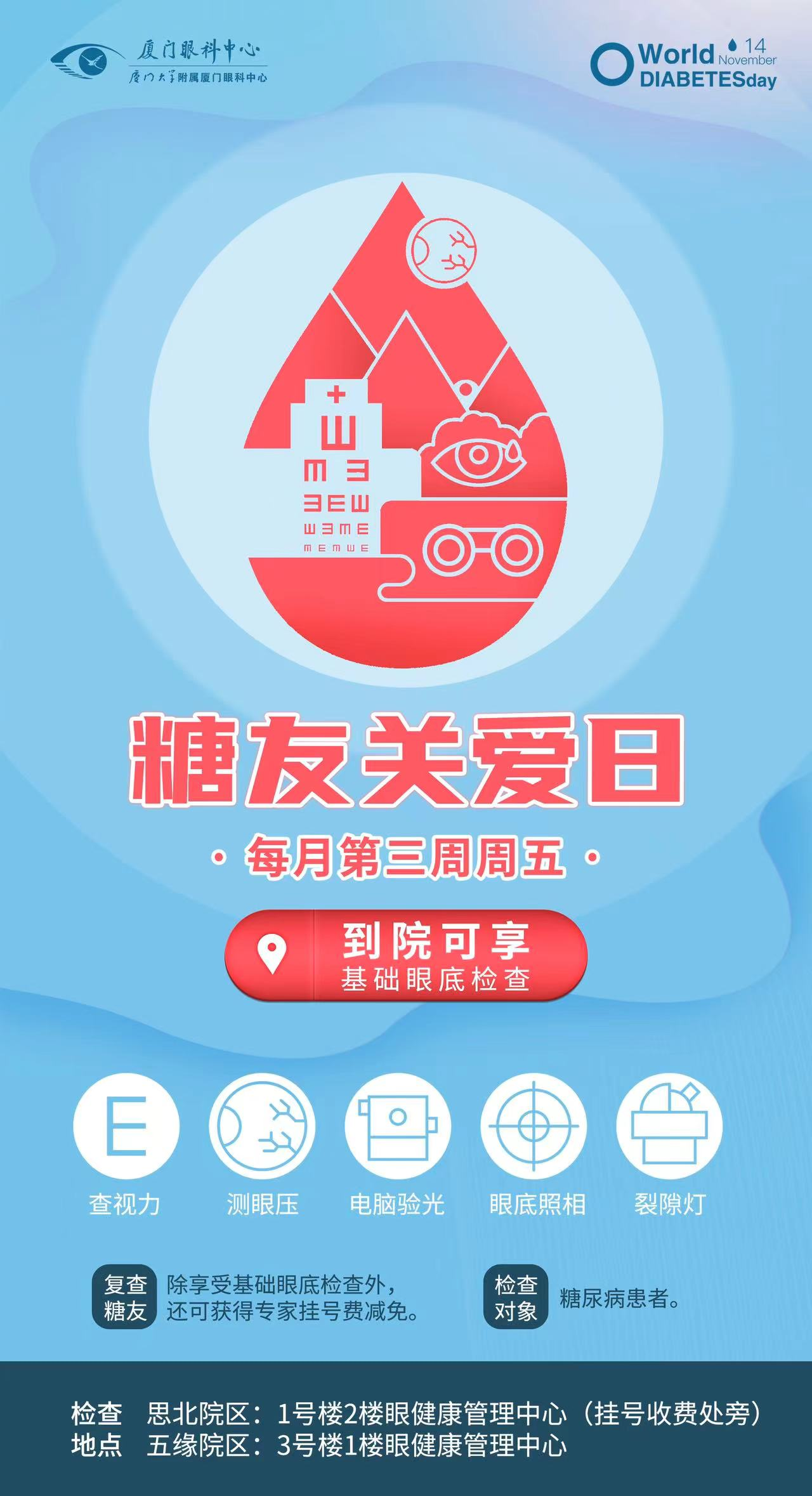 廈門眼科中心暖心設(shè)立糖友關(guān)愛日,每月第三周的周五糖尿病患者憑糖尿病診斷到院,即可免費享受雙重驚喜福利。