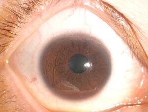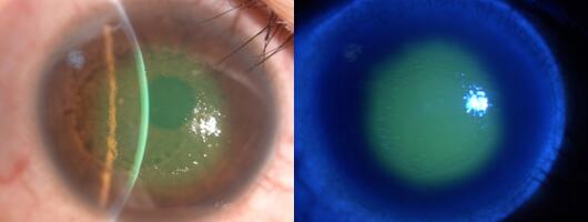 王女士回家后趕緊滴了眼藥水,未想第二天右眼疼痛更加明顯,已無(wú)法正常睜眼,視力也降到只有眼前手動(dòng)。這下王女士慌了神,決定還是到正規(guī)專(zhuān)科醫(yī)院看病為好,經(jīng)人介紹,王女士來(lái)到廈門(mén)眼科中心找到修陽(yáng)暉博士就診。經(jīng)過(guò)詳細(xì)的檢查后,修陽(yáng)暉博士發(fā)現(xiàn)王女士患上了嚴(yán)重的角膜炎,中央?yún)^(qū)角膜已大部分受綠膿桿菌感染及浸潤(rùn)。
