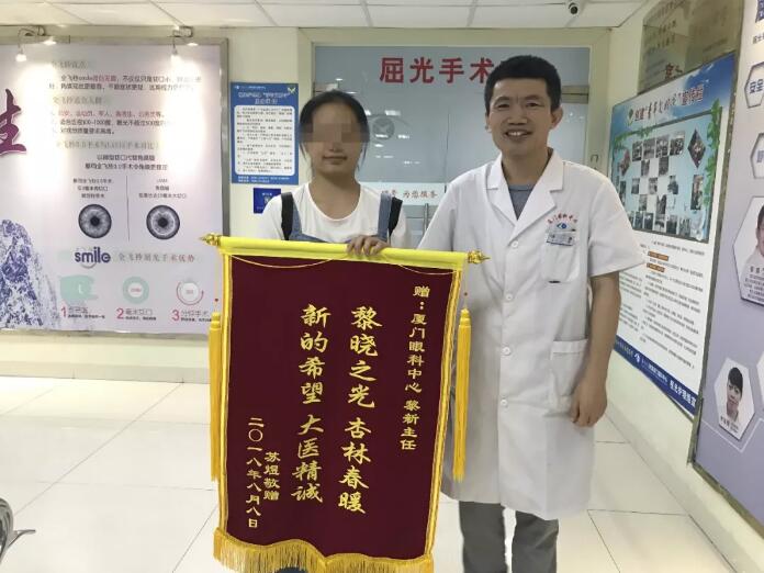 “克服內(nèi)心的恐懼不容易,幸好有黎新主任耐心引導(dǎo),讓我擺脫內(nèi)心的恐懼,成功摘鏡眼鏡,我非常非常感謝黎新主任。”雙眼視力已矯正到1.2的小蘇懷著無比激動(dòng)的心情說。為了表達(dá)自己的感激之情,她還特意給黎主任寫了詩、感謝信、贈(zèng)送錦旗。