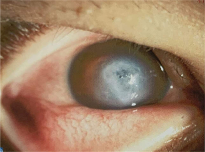 小森的右眼就是角膜變薄導(dǎo)致角膜內(nèi)層結(jié)構(gòu)破裂,角膜出現(xiàn)水腫,視力驟降,屬于急性圓錐角膜發(fā)作。商旭敏博士接診時,距離小森發(fā)病已過去了2天,他的右眼角膜已呈現(xiàn)肉眼可見的白色。