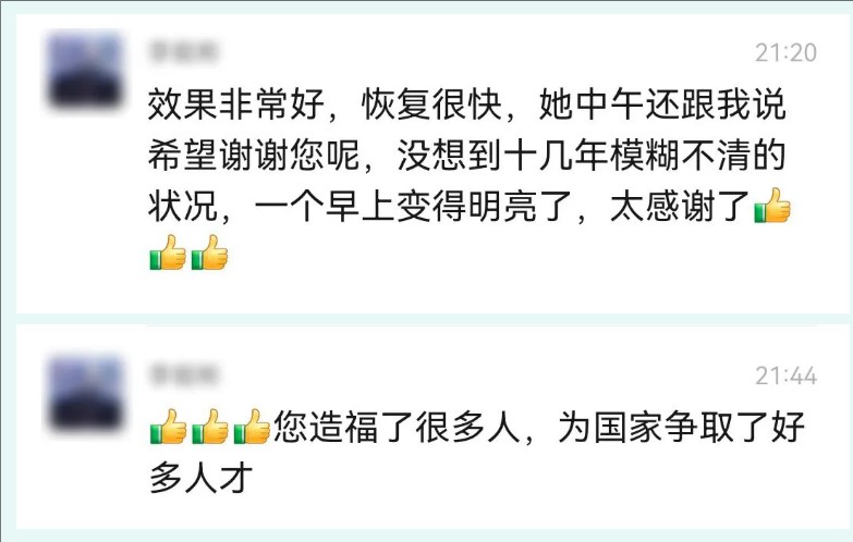 "效果太好了,恢復特別快!沒想到十幾年模糊不清的世界,一個早上就亮了,太感謝了!"