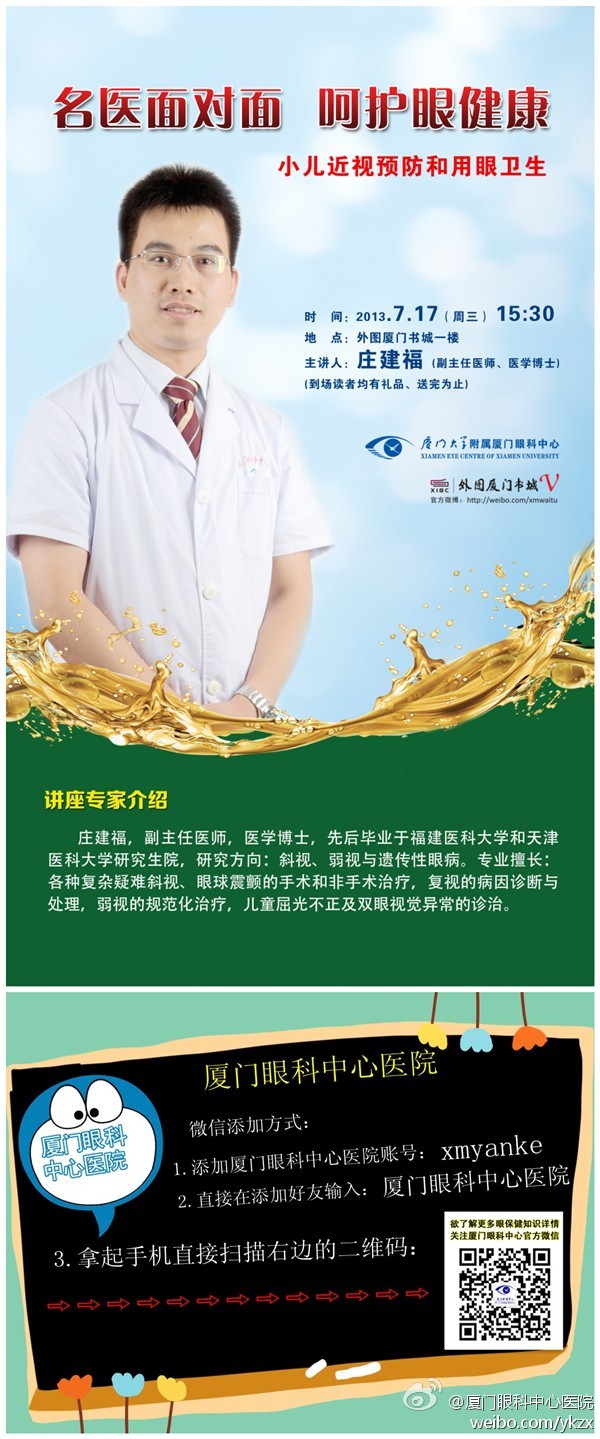【文章導(dǎo)讀】2013年7月17日15:30分,廈門(mén)眼科中心小兒眼科莊建福博士將在外圖廈門(mén)書(shū)城一樓免費(fèi)為青少年講述如何預(yù)防近視?,F(xiàn)場(chǎng)將還有免費(fèi)禮品贈(zèng)送。