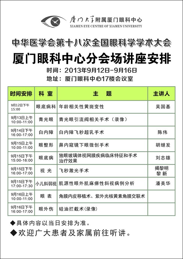 廈門眼科中心作為大會指定手術(shù)直播醫(yī)院,更是備受關(guān)注。學術(shù)大會期間,廈門眼科中心將作為分會場,展開一系列講座。具體安排如下: