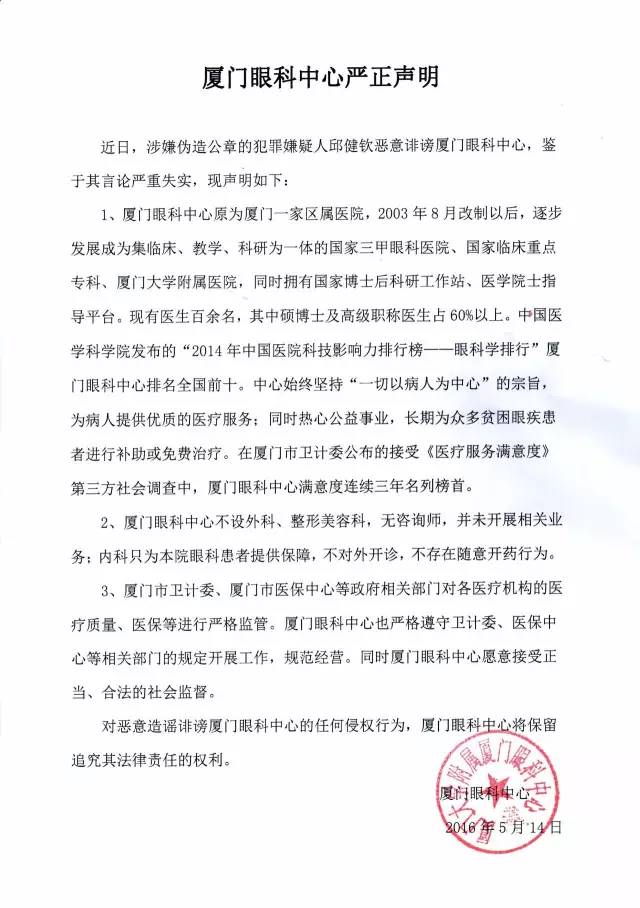 近日,涉嫌偽造公章的犯罪嫌疑人邱健欽惡意攻擊誹謗廈門眼科中心,鑒于其言論嚴重失實,現(xiàn)聲明如下: