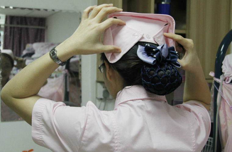 護(hù)士帽的設(shè)計(jì)初衷是為了防止頭發(fā)脫落,避免污染,實(shí)現(xiàn)無菌操作。然而在實(shí)際工作中,護(hù)士帽材質(zhì)較硬,不易清洗,容易傳播病菌,并且需要用發(fā)夾固定在頭上,護(hù)士搶救動(dòng)作快一點(diǎn)時(shí),帽子容易掉在地上。
