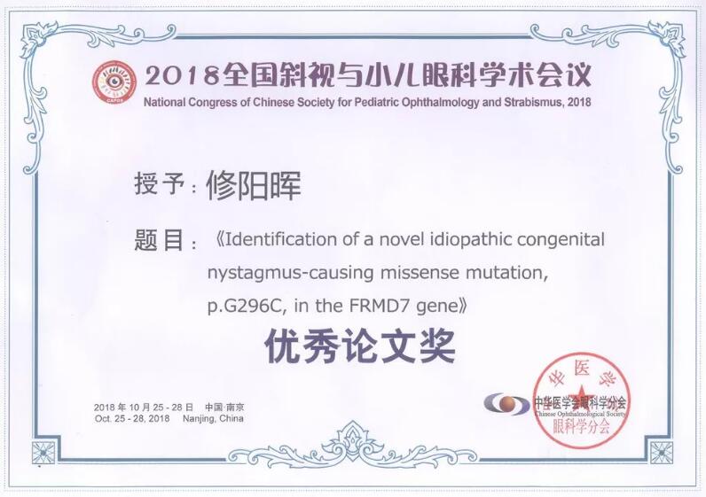 ◆ 廈門眼科中心斜視與小兒眼科修陽(yáng)暉博士撰寫(xiě)的關(guān)于先天性眼球震顫致病基因的論文《Identification of a novel idiopathic congenital nystagmus-causing missense mutation, p.G296C, in the FRMD7 gene》榮獲大會(huì)十佳“優(yōu)秀論文獎(jiǎng)”。