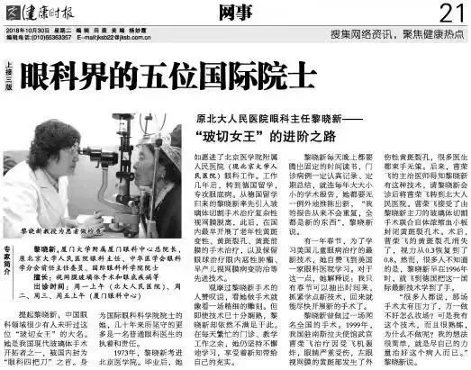 2018年10月30日,人民日?qǐng)?bào)社屬報(bào)紙《健康時(shí)報(bào)》對(duì)廈門大學(xué)附屬?gòu)B門眼科中心總院長(zhǎng)黎曉新進(jìn)行大篇幅報(bào)道。