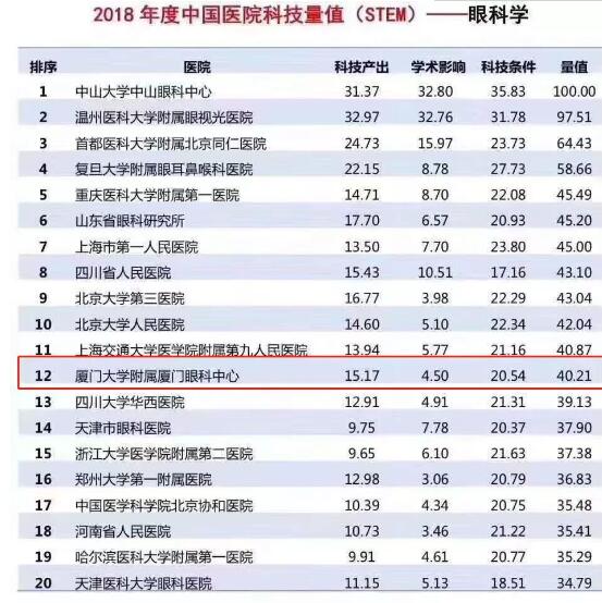 廈門(mén)大學(xué)附屬?gòu)B門(mén)眼科中心榜上有名,位列專(zhuān)科榜單全國(guó)第12!