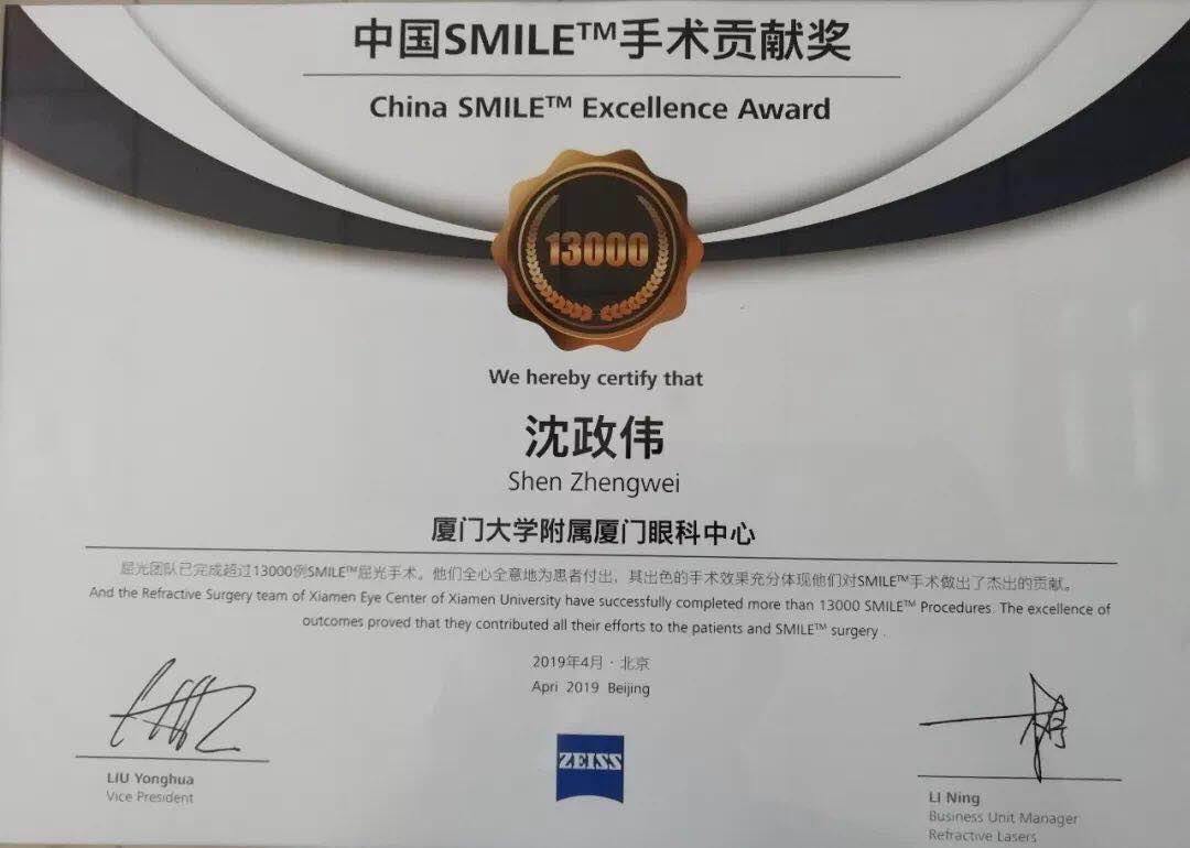 此次會(huì)議授予了沈政偉院長“中國SMILE™手術(shù)貢獻(xiàn)獎(jiǎng)”。此獎(jiǎng)項(xiàng)代表著對(duì)沈政偉院長的信任與肯定以及對(duì)廈門眼科中心的認(rèn)可,也代表著沈政偉院長在屈光手術(shù)方面的成就與榮譽(yù)。