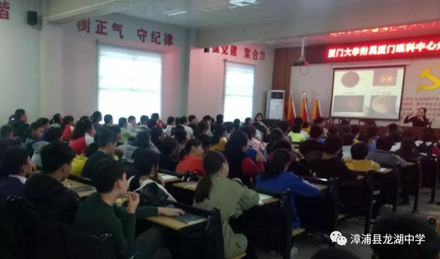2019年12月17日下午,廈門大學(xué)附屬?gòu)B門眼科中心走進(jìn)漳浦縣龍湖中學(xué),響應(yīng)國(guó)家提倡預(yù)防和控制青少年近視的政策,與龍湖中學(xué)共同開展青少年近視防控講座,主題是“近視防控,愛眼護(hù)眼,從你我做起”。龍湖中學(xué)校長(zhǎng)蔡漢云,廈門大學(xué)眼科中心視光科任小軍主任醫(yī)生,洪聰波、劉淑婷、張娜、王黃超醫(yī)師,龍湖中學(xué)有關(guān)領(lǐng)導(dǎo),七年1班、2班、3班班主任和三個(gè)班的全體學(xué)生近兩百人參加講座。