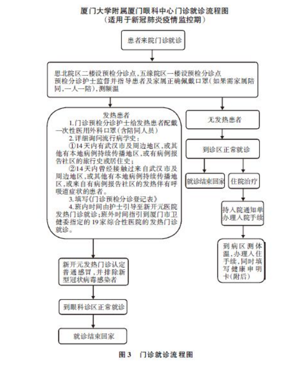 2019年12月以來新型冠狀病毒肺炎疫情迅速蔓延,面對這種傳染性極強(qiáng)的新冠病毒,眼科醫(yī)護(hù)人員應(yīng)該在救治眼科患者的同時做好醫(yī)患人員的防護(hù)。下面就廈門眼科中心根據(jù)衛(wèi)生健康委的要求(圖1,2)在疫情期間開診過程結(jié)合眼科的特點制定并不斷完善了這些流程,供眼科同道參考。