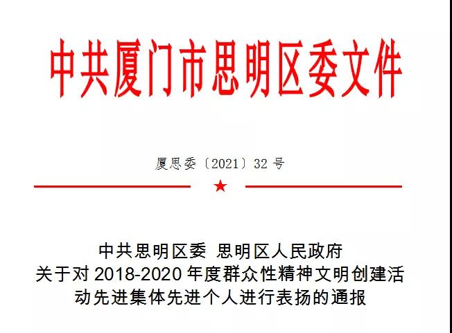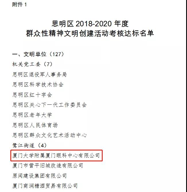 近日,中共廈門市思明區(qū)委、思明區(qū)人民政府印發(fā)《關(guān)于對2018-2020年度群眾性精神文明創(chuàng)建活動先進(jìn)集體先進(jìn)個(gè)人進(jìn)行表揚(yáng)》,對在精神文明創(chuàng)建活動中,涌現(xiàn)出的工作扎實(shí)、成績突出、影響廣泛的的市級文明集體、個(gè)人進(jìn)行通報(bào)表揚(yáng),廈門大學(xué)附屬廈門眼科中心光榮上榜。