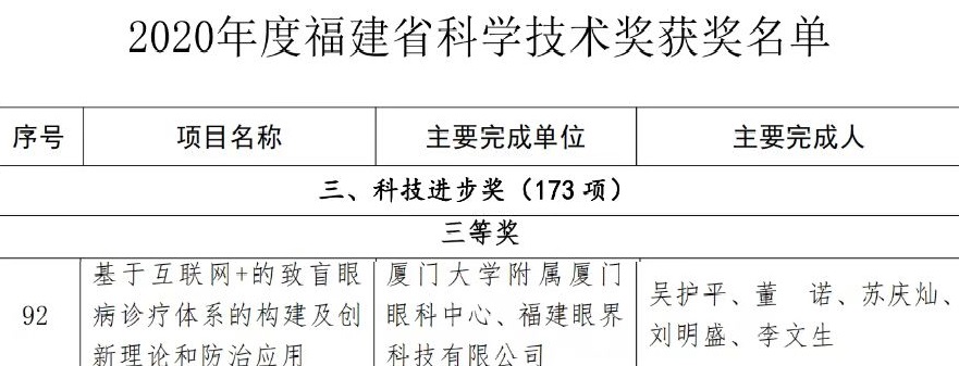 【文章導(dǎo)讀】近日,福建省人民政府發(fā)布《福建省人民政府關(guān)于 2020 年度省科學(xué)技術(shù)獎勵(lì)的決定》,其中廈門眼科中心憑借“基于互聯(lián)網(wǎng)+的致盲眼病診療體系的構(gòu)建及創(chuàng)新理論和防治應(yīng)用”項(xiàng)目上榜