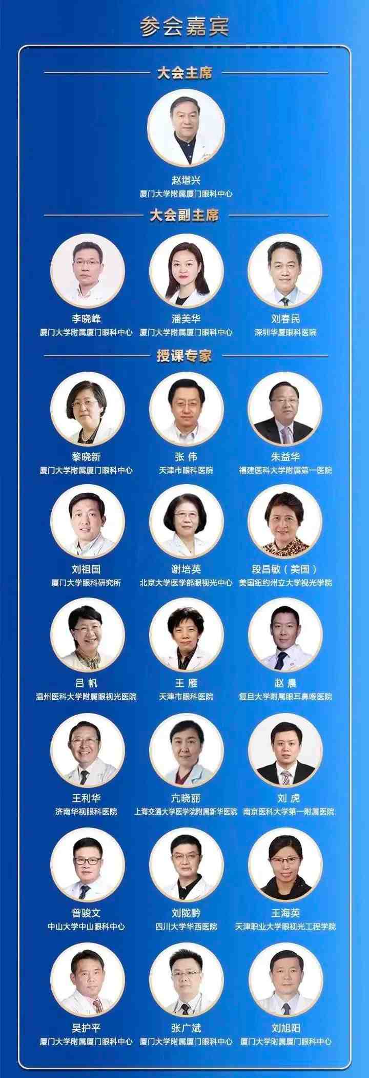 授課專家包括國際眼科科學(xué)院院士、亞太地區(qū)斜視與小兒眼科學(xué)會副主席趙堪興教授;國際眼科科學(xué)院院士、廈門眼科中心總院長黎曉新教授;中華醫(yī)學(xué)會眼科學(xué)分會斜視與小兒眼科學(xué)組組長張偉教授;中華醫(yī)學(xué)會眼科學(xué)分會眼視光學(xué)組組長呂帆教授;以及朱益華教授、劉祖國教授、王利華教授、段昌敏教授(美國)、謝培英教授、王雁教授、亢曉麗教授、趙晨教授、劉虎教授、劉隴黔教授、曾駿文教授、潘美華教授、張廣斌教授、吳護(hù)平教授、劉旭陽教授、王海英教授等重量級業(yè)界專家和講者。