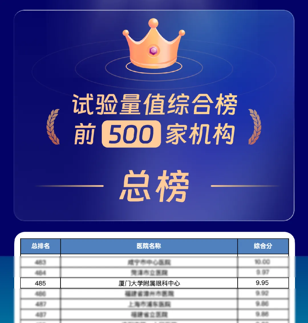 近日,新一年度的《全國GCP機構藥物臨床試驗量值排行榜》正式發(fā)布,廈門眼科中心再次入列全國排行榜單!