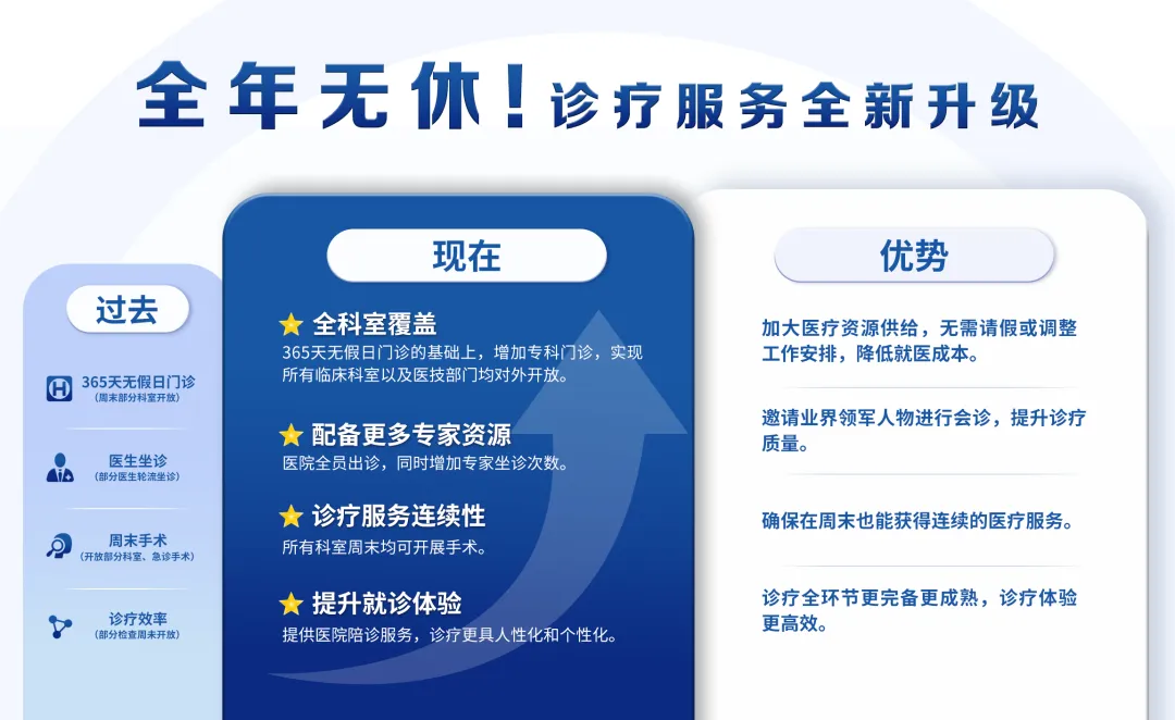 通過實(shí)施“無假日門診,診療再升級,周末開通門診”的組合方案,醫(yī)院可以在時間和服務(wù)質(zhì)量上雙重提升,確保患者在任何時間都能獲得高質(zhì)量的醫(yī)療服務(wù)。這不僅提高了患者的就診體驗(yàn),也增強(qiáng)了醫(yī)院的整體競爭力和服務(wù)水平,真正實(shí)現(xiàn)就醫(yī)無障礙,看病無需再請假,周末也能看醫(yī)生!