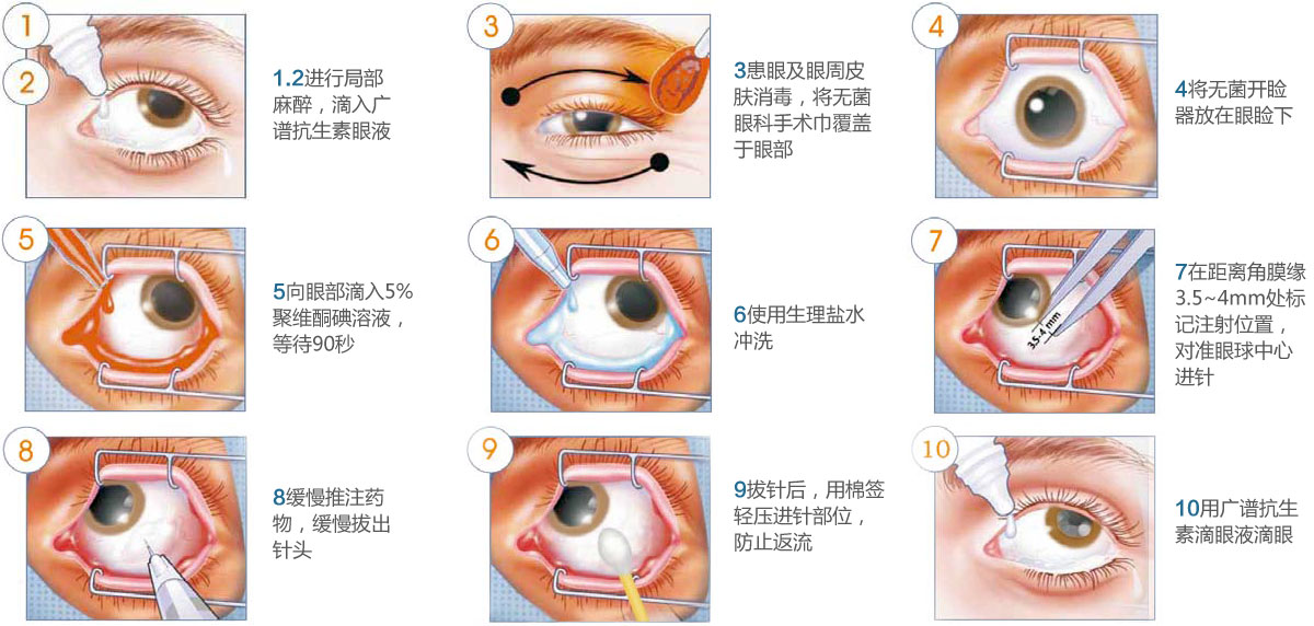 眼內(nèi)注藥是從白眼球進針,將藥物注射至眼球內(nèi)。表面麻醉即可,注射過程數(shù)秒鐘,痛感不明顯,不必擔心。