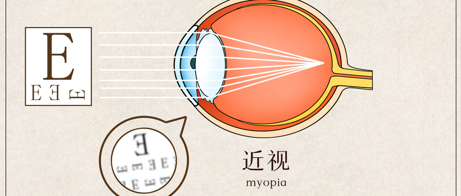 眼軸變長,當(dāng)平行光線進(jìn)入眼球時(shí),遠(yuǎn)處的物體成像在視網(wǎng)膜前,在視網(wǎng)膜上就是模糊的像,導(dǎo)致我們看遠(yuǎn)處的東西不清楚,這就是我們常說的近視(軸性近視)。