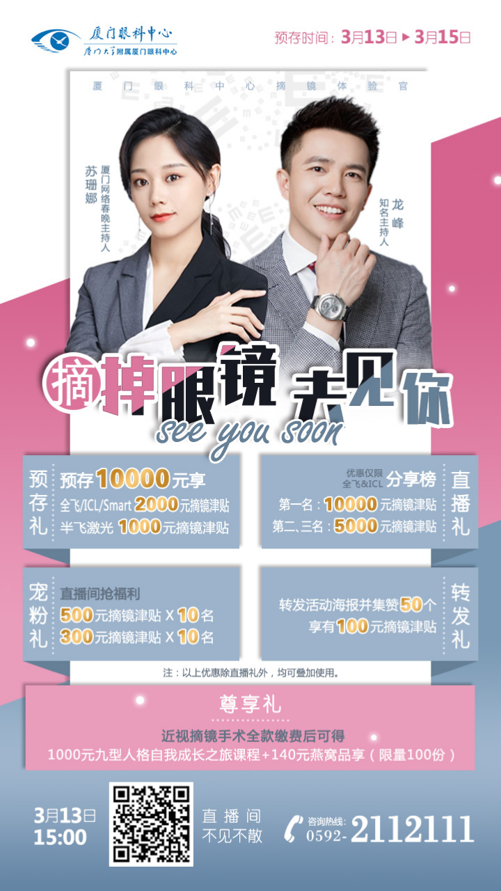 更多近視手術(shù)符合條件,請(qǐng)撥打電話: 0592-211 2111 詳詢