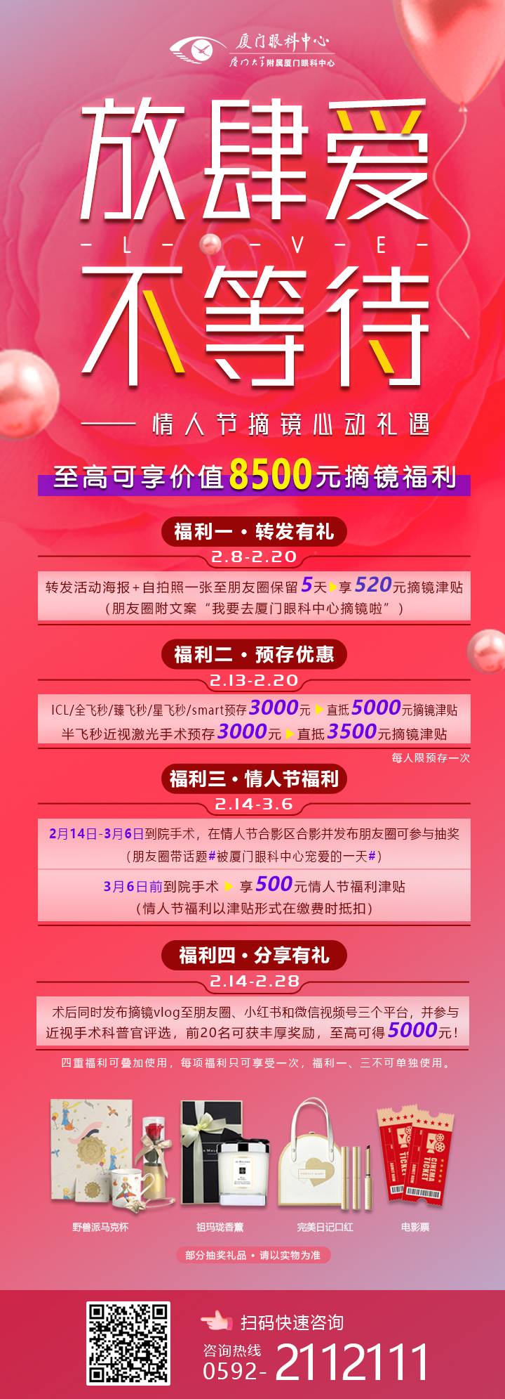 3月6日前到院手術(shù)可享500元到院紅包(到院紅包由津貼形式在繳費時抵扣)。2月14日-3月6日前到院手術(shù),在屈光中心情人節(jié)布景區(qū)合影并帶話題#被廈門眼科中心寵愛的一天#,發(fā)布至朋友圈即可參與抽獎。抽獎時間:2月14日-3月6日(現(xiàn)場抽獎每人限一次,人人皆可中獎。禮品包含祖瑪瓏香薰、野獸派杯子、完美日記口紅、電影票2張等。)