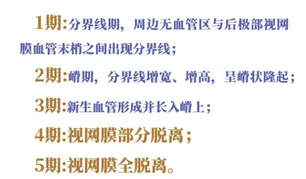 早產(chǎn)兒視網(wǎng)膜病變根據(jù)不同的程度可以分為5期: